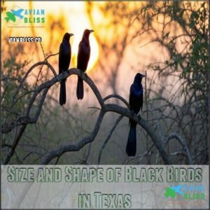 When identifying black birds in Texas, focus on their relative size and unique features like bill shape, tail length, and body mass.