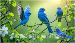 You’ll notice that Virginia’s blue birds follow distinct migration patterns, with some species like Indigo Buntings traveling thousands of miles to Central and South America each winter, while others such as Eastern Bluebirds and Blue Jays remain in the state year-round due to the mild climate.
