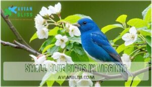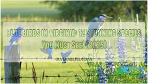 - You’ll find over 15 species of blue birds in Virginia, ranging from tiny Indigo Buntings to massive Great Blue Herons, with each species thriving in specific habitats from coastal marshes to mountain forests.
