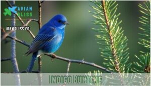 You’ll encounter the vibrant Eastern Bluebird with its sky-blue back and rusty chest, the all-blue Indigo Bunting during summer months, the bold Blue Jay year-round, and occasionally the Mountain Bluebird in open areas.