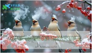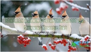 - You’ll recognize bohemian waxwings by their distinctive waxy red wing tips, crested heads, and larger size compared to cedar waxwings, making them easier to identify in the field.