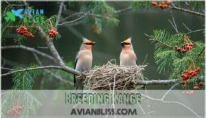 You’ll find these remarkable fruiteating birds thriving in Boreal Forests across northern regions, where they feast on abundant berries.