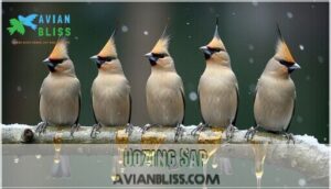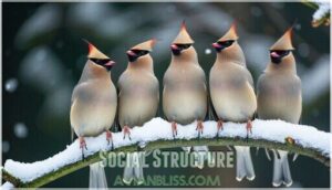 You’ll find these remarkable songbirds sport waxy red wing tips that look like tiny candle drips. They’re nomadic wanderers, following berry crops across northern forests in unpredictable flocks.