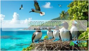 You’ll encounter boobies nesting on isolated tropical islands where coastal cliffs, beaches, and low vegetation meet productive ocean foraging zones. Red-footed boobies breed colonially across Indian Ocean atolls like Aldabra—where over 22,000 active nests were counted—while brown boobies claim Caribbean cays and shoreline bluffs.