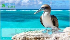 Across booby species, you’ll notice plumage variation reflecting both maturity and sexual dimorphism. Blue-footed Boobies span 81–90 cm with brown-and-white contrast, while Red-footed Boobies display three morphs and reach 69–79 cm. The Masked Booby, largest at 85 cm, shows striking white plumage with a black facial mask.