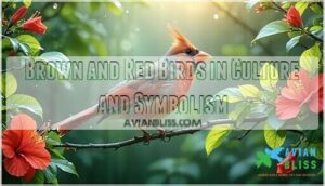 You’ll find brown and red birds carry deep meaning across many cultures, from Native American traditions that honor cardinals as messengers to religious symbols of hope and renewal.