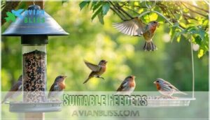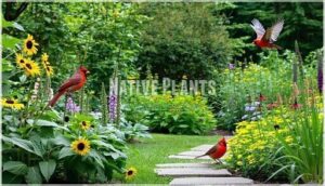 - You’ll find different species in specific habitats – cardinals prefer dense woodlands and suburban areas, vermilion flycatchers thrive in desert scrublands, while house finches adapt well to urban environments and backyard feeders.