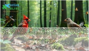 - You’ll notice these birds change their appearance seasonally, with males displaying brighter red plumage during breeding season and duller colors in winter, while juveniles start with muted brown feathers before developing adult coloration.