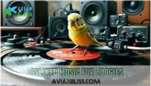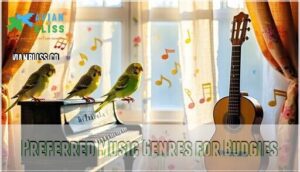 You’ll discover budgies groove to soft classical tunes and gentle instrumentals, often enjoying Mozart, light piano compositions, and nature sounds.