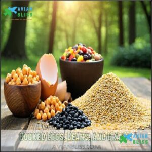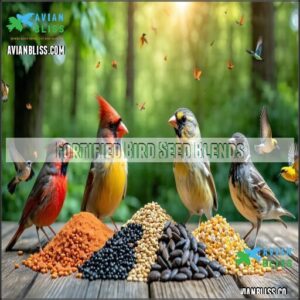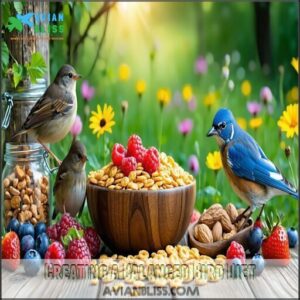 A diverse menu attracts more species while reducing bird food risks, making your backyard become a bird-safe haven. To guarantee balanced nutrition, consider supplementing their diet with high-quality pellets.