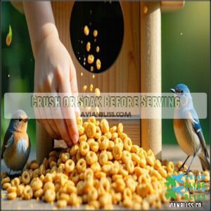 Feeding Cheerios to birds requires careful preparation to guarantee their safety. You should crush or soak them, stick to plain varieties, and only offer small amounts.