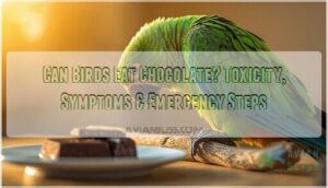 No, birds can’t eat chocolate—it’s life-threatening. Chocolate contains theobromine and caffeine, two stimulants your bird’s system can’t process the way yours does. While chocolate metabolism in humans is straightforward, birds lack the enzymes to break down these compounds efficiently. That’s why even tiny amounts pose serious risks to pet bird safety and wildlife conservation efforts alike.