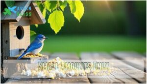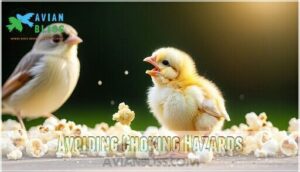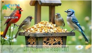You’ll want to remove any hard kernels before feeding or consider soaking duration of 15-20 minutes to soften them. Always supervise feeding sessions and offer alternative treats like cracked corn for safer bird feeding tips.