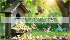 You’ll find that plain popcorn offers several nutritional advantages when you serve it as an occasional treat to your feathered visitors, providing essential minerals like iron for healthy blood circulation and calcium for strong bones.