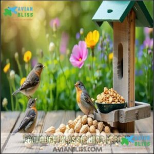 Unsalted roasted peanuts offer excellent nutritional value for your backyard birds. The roasting benefits include reduced risk of harmful aflatoxins while preserving protein content essential for bird health.