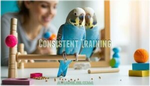 Remember, patience importance can’t be overstated—repetition frequency determines success in parakeet training tips.