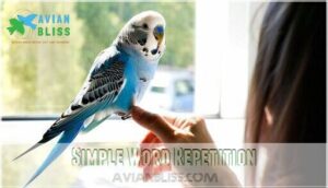 You’ll need to repeat simple words and phrases multiple times throughout the day, as parakeets learn through mimicry techniques that require frequent exposure.
