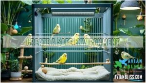 Creating a safe environment becomes essential when your budgie experiences feather loss. Your cage setup should prioritize soft landings with cushioned flooring and remove sharp objects that could worsen budgie flight issues.