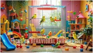 Mental stimulation becomes your budgie’s lifeline during tail feather recovery, helping maintain psychological wellness while physical healing occurs.