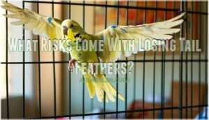 When tail feathers go missing, your budgie faces serious risks that can’t be ignored. Flight Instability becomes the primary concern, as these feathers normally act as your bird’s built-in steering system. Without them, your budgie’s aerodynamic issues turn every flight attempt into a potential disaster.
