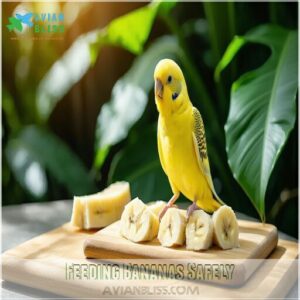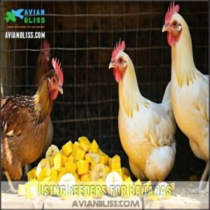 You’ll need to wash bananas thoroughly and cut them into small, manageable pieces before offering them to your flock, as this prevents choking and guarantees they’re free from harmful pesticides.