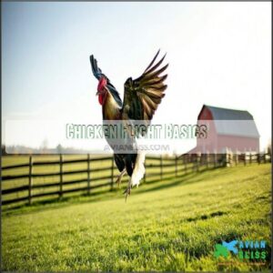 If you’re wondering about chicken flight capabilities, vertical takeoff is their showstopper. Their wing movement packs enough punch for a leap skyward—think 10 feet up if they’re light breeds. But horizontal flight? That’s another story. Air resistance and chicken wing anatomy keep them grounded after 30–40 yards. Their flight patterns favor speed over distance, and abrupt landings prove their aerodynamics are quirky at best.