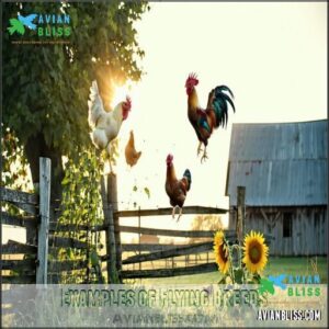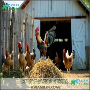 Some chicken breeds surprise you with their flight abilities—Leghorns, Anconas, and Sumatras dart higher thanks to slender wing structure and lively fowl genetics.