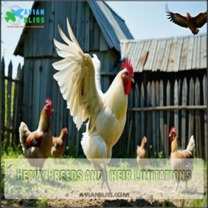 Chicken breeds and flight are linked: big, stocky breeds can’t soar while lighter, heritage types still surprise you. These breeding impacts trump old-school tricks like chicken wing binding techniques. Today, chicken breed characteristics are quite literally grounded—by design, not by accident.