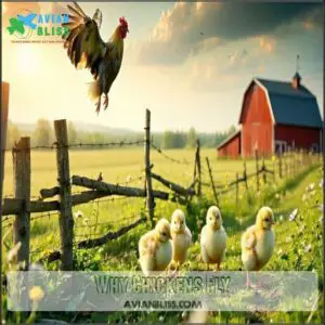 Risk is a constant companion for chickens who take to the air. Your flock’s short flights aren’t just playful leaps—they come with real hazards. For instance, awkward landings often result in flight injuries like fractures or sprains, especially to the keel bone. Muscle atrophy can set in after wing damage or feather loss, making future escapes even riskier. There’s also the threat of flystrike risks—open wounds from rough landings or predator attacks invite maggots and infection.