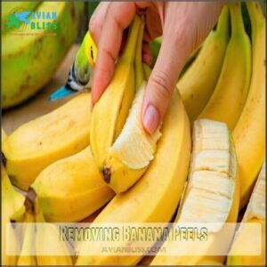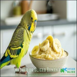 Watch for signs of picky eating when introducing bananas, as their sweetness might make your bird reject healthier foods. Moderation is key—this prevents calorie overload while protecting your parakeet’s liver and kidney health.