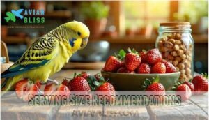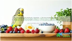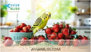 While safe fruits for parakeets like strawberries offer bird wellness benefits, they shouldn’t exceed 5% of your bird’s daily intake.