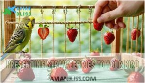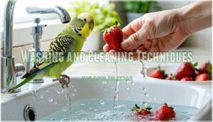 You’ll want to wash thoroughly, decide on serving size, and handle stems correctly before offering this sweet treat to ensure your parakeet’s safety and enjoyment of the strawberries.