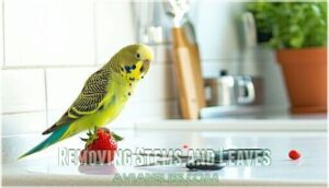 Most parakeets won’t eat strawberry stems, so you should remove them before serving. Green leafy tops can be bitter and tough for small beaks to handle. Focus on fruit preparation that prioritizes your bird’s safety and enjoyment.