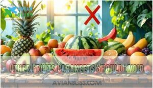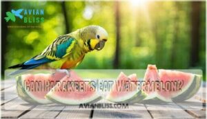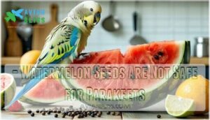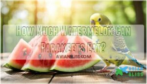 Ironically, while watermelon’s high water content seems harmless, you’ll notice diarrhea, lethargy, and digestive upset when your parakeet overindulges. Watch for loose droppings and reduced activity levels after feeding.