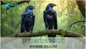 You’ll discover that ravens possess a complex vocal toolkit with over 33 distinct calls, each serving specific social functions from territory marking to family bonding.