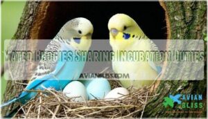 When you’re observing budgie breeding behavior, you’ll notice that mated pairs naturally share incubation duties through partner bonding and instinctive cooperation.