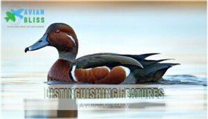 You’ll recognize canvasbacks by their distinctive sloping forehead that seamlessly flows into a long, wedge-shaped bill, creating a smooth profile unlike any other duck.
