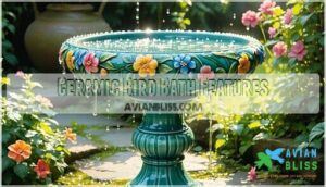 When choosing a ceramic bird bath, you’ll notice features like glazed finishes, hand-painted details, and sturdy pedestal designs.