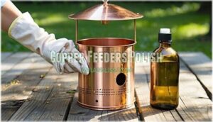 You’ll need to adjust your cleaning methods based on whether you’re working with wooden feeders that shouldn’t use bleach, copper feeders that need periodic polishing, or tube feeders that require specialized brushes to reach every corner.