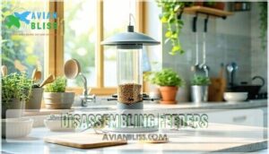 You’ll want to completely disassemble your feeder to reach every nook and cranny where bacteria and mold can hide, just like taking apart a puzzle to clean each piece thoroughly.
