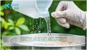 Use a 1:9 bleach solution for effective bird feeder bacteria elimination, or try bleach alternatives like equal parts vinegar and water as safe solutions.