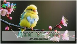 Your bird’s most common nutritional diseases include vitamin A deficiency, calcium imbalance, and protein malnutrition. You’ll notice poor feathers, weak bones, and respiratory issues when their diet lacks essential nutrients.