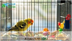 Watch for respiratory problems like labored breathing or unusual sounds—these need immediate attention. Don’t let nutritional deficiencies clip your bird’s wings; a seed-only diet is a recipe for trouble.