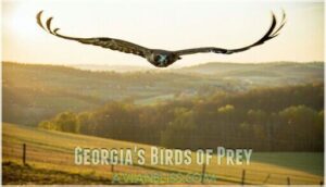 You’ll spot Georgia’s raptors soaring overhead or perched on fence posts, scanning for their next meal with razor-sharp eyesight.