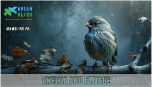 You’ll notice fatigue signs like lethargy, pale combs, and reduced activity as anemia causes weaken your pet’s defenses.
