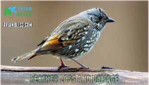 You’ll notice feather breakage at the shaft base, irregular molting issues, and overall plumage damage that compromises your bird’s natural insulation.