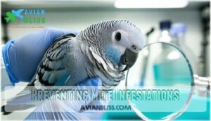 Focus on thorough bird hygiene practices, ensuring cage cleanliness through weekly deep-cleaning routines that eliminate mite breeding grounds effectively.