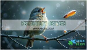 You’ll notice open-mouth breathing and respiratory distress as key mite infestation symptoms.