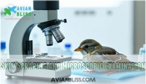 Beyond visual checks, skin sampling provides definitive mite identification through microscopic examination. You’ll need proper diagnostic tools and laboratory tests to confirm infestations.