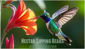 - You’ll find that bird beaks function as specialized multi-tools, with each shape perfectly matching specific feeding needs—cardinals crack seeds with cone-shaped beaks, hummingbirds probe flowers with needle-thin bills, and hawks tear meat with sharp, hooked designs.